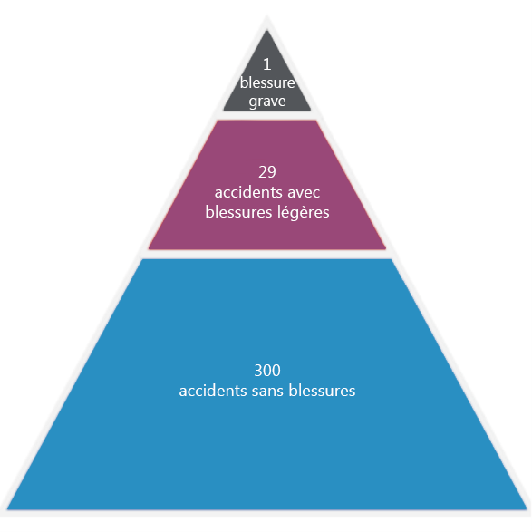 Le triangle des accidents, également connu sous le nom de triangle de Heinrich ou de triangle de Bird, illustre la relation entre les incidents mineurs et les blessures graves. Les recherches montrent que pour une blessure grave, il y a généralement 29 blessures mineures et 300 quasi-accidents ou actes dangereux. Cela signifie que si nous nous concentrons à traiter et à réduire les accidents évités de justesse, nous pouvons prévenir les blessures mineures et, en fin de compte, les accidents graves. La déclaration des accidents évités de justesse nous permet d'intervenir rapidement et d'interrompre la chaîne d'événements susceptibles d'entraîner une blessure grave.